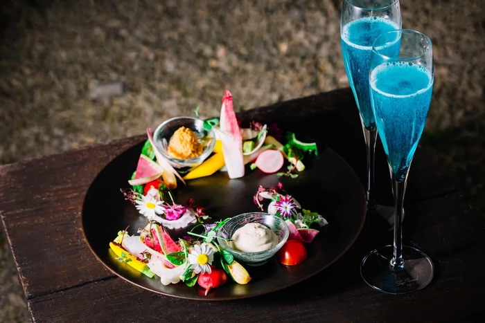 古くから竹富島で親しまれている島らっきょうや青パパイヤ、紅芋などの野菜を、島豆腐のクリームと粟味噌と合わせて楽しみます。色鮮やかなスパークリングワインを片手に、天の川をイメージした野菜のピクニックプレートをつまみながら星を眺めます。