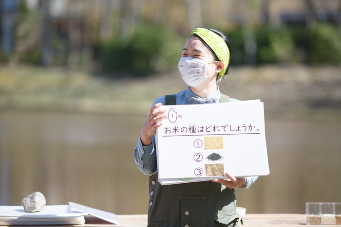 今年一年の米作りを決める、とても大切な種まき。ゲストスピーカーとして「稲作本店(FARM1739)」の井上氏が「種からはじまるお米の一年」について語り、参加者は、クイズ形式で「お米の種は何か」などを学びました。その後、実際に手作業で育苗箱に床土(とこつち)、種を丁寧に撒き、覆土(ふくど)を行い、育苗箱40枚の作成を終えられました。