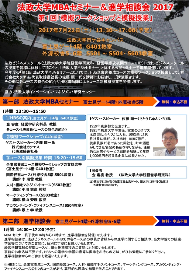 法政大学大学院経営学研究科経営学専攻夜間コース(法政ビジネススクール:以下HBS)は、2017年7月22日(土)にビジネススクールの授業を体験できる「法政大学MBAセミナー」を開催します。