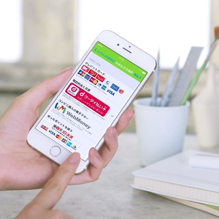 クレジットカード決済、携帯電話の通信料金と合わせて支払えるキャリア決済(auかんたん決済、dケータイ払いプラス、ソフトバンクまとめて支払い)、コンビニで買える電子マネー(WebMoney)、楽天ID決済に対応しています。