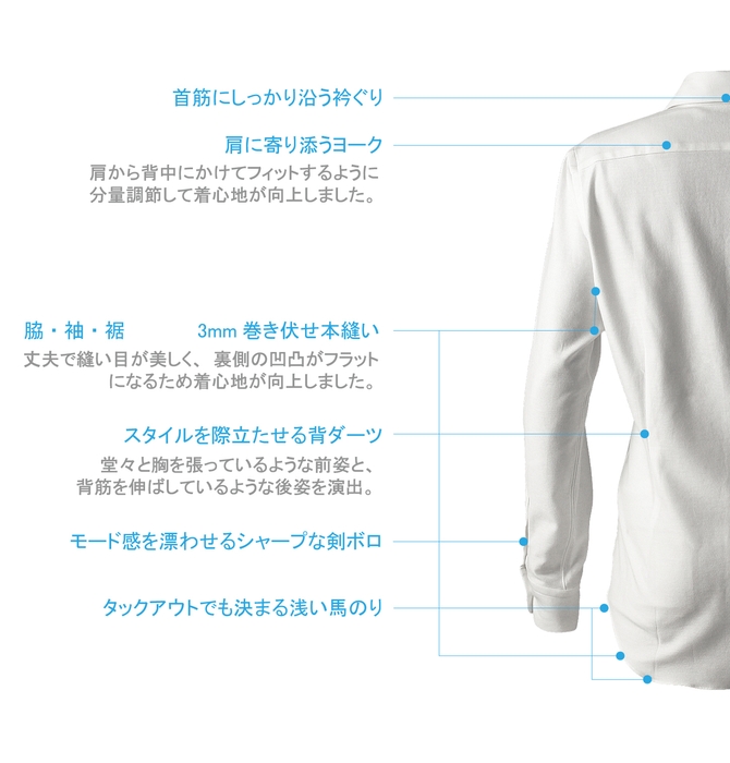 ビジネスシーンは想像以上にシビアで、長時間の仕事に体は緊張している。そんな中で結果を左右するのは意外にも、服の着心地だと言われています。特にシャツの着心地が悪ければすぐに体が疲れてしまい、思うようなパフォーマンスが発揮できません。decollouomoのシャツはまるでカーディガンのように伸縮して、着心地はしなやか。長時間のデスクワークでも負担が少なく、着ていることを忘れてしまうような快適なフィット感です。