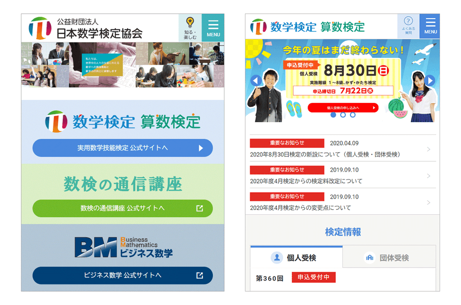 リニューアルした公式サイト トップページ(左:公益財団法人 日本数学検定協会公式サイト、右:実用数学技能検定公式サイト)