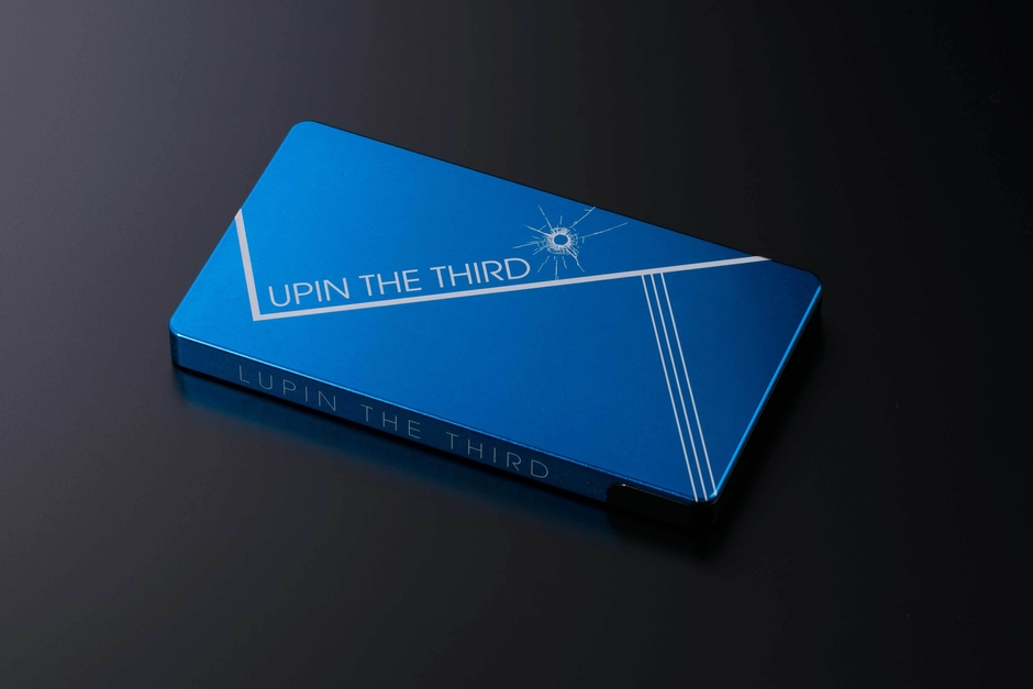 ジュラルミン削り出しのカードケース。ルパンのジャケット色をイメージし、ビジネスシーンでも使用できるよう、シンプルに仕上げました。裏面にはごくろうさんマークをワンポイントにデザインしました。