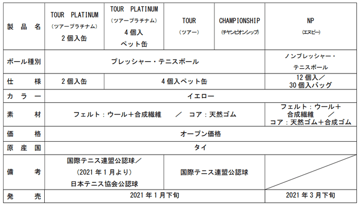 ITF公認の上記3機種に加え、入門者向けの練習用・レジャー用ノンプレッシャーボール「NP」も発売することで、国際大会公認球から練習球、レジャー向けボールまで、幅広いラインナップを展開し、テニスプレーヤーの多様なニーズにお応えします。
