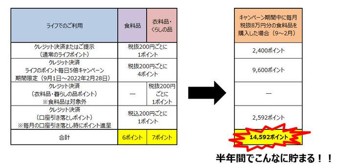 ライフのお買い物で200円(税抜)ごとに1ポイント、さらにLC JCBカードのクレジット決済で4ポイント進呈
