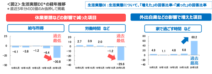 【生活実態の推移】生活実態にも大きな変化がみられた。特に「自宅で過ごす時間」は前回調査より大きく増加し、過去最高値を記録。その他にも「睡眠時間・趣味に費やす時間・食費」の時間が増加。一方、「給与所得」「労働時間」は調査開始以来の最低値となった。「預貯金・お小遣い・労働時間」も減少した。<図2>