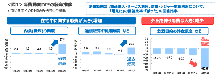 【消費動向の推移】多数の項目でDI値が調査開始以来の上げ幅・下げ幅を記録。特に「中食・内食・冷凍食品・発泡酒・電気料金・通信販売」で大きく増加した。一方、 「外食・旅行・タクシー・高速道路・ガソリン・ショッピング/レジャー関連施設」では、調査開始以来の最低値となった。外出自粛・休業要請による影響が顕著にみられた。 <図1>