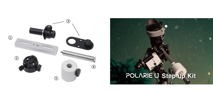 ポータブル赤道儀「星空雲台ポラリエU(WT)」を使って、さらにステップアップした星空写真を撮影するためのキットです。 新製品の①デュアルスライドバーに、②クイックリリースパノラマクランプ、③ポラリエU極軸望遠鏡PF-LIIセット、④APフォトガイダー用ウェイト軸、⑤バランスウェイト1kgがセットになっています。