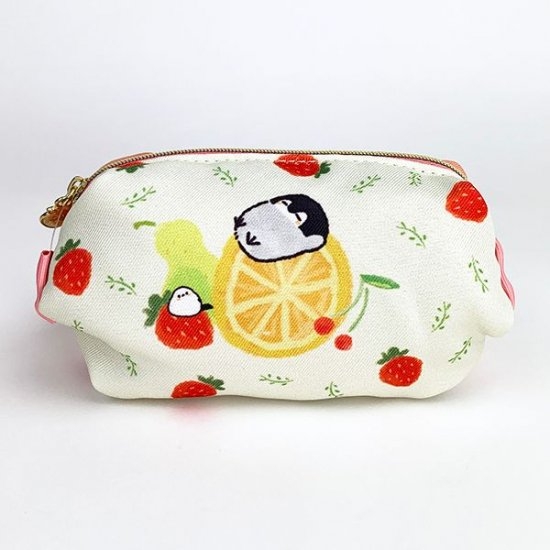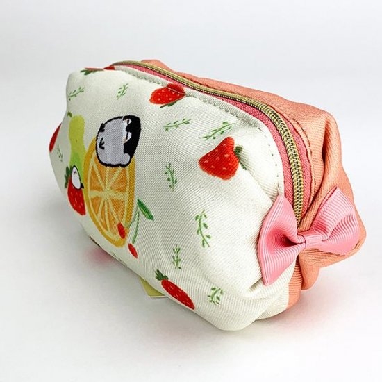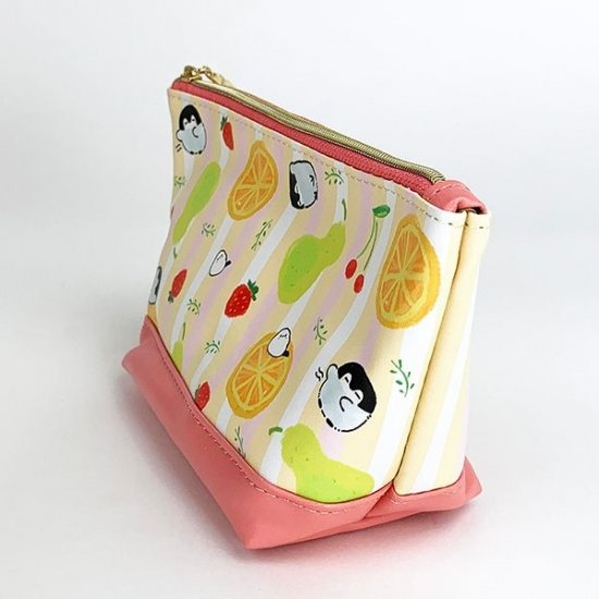 今回ご紹介するポーチは2種類です。まず1つめはこちらのフルーツいっぱいキャラメルポーチ♪フルーツにちょこんと乗った2匹が可愛すぎるデザイン。