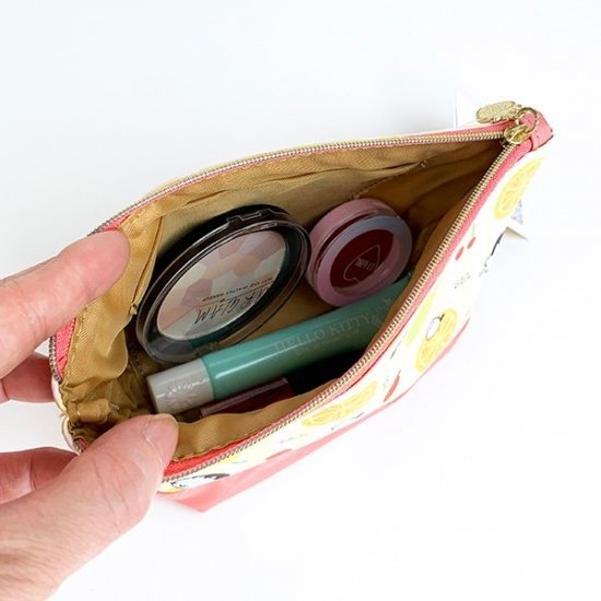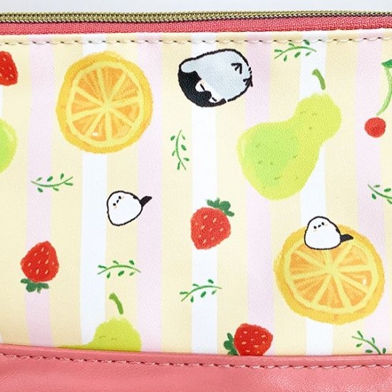 つづいてもコウペンちゃん×フルーツの組み合わせデザインのポーチですが、テイストがまた違います。こちらはいろんなポーズのコウペンちゃんやフルーツが散らばったデザインです。