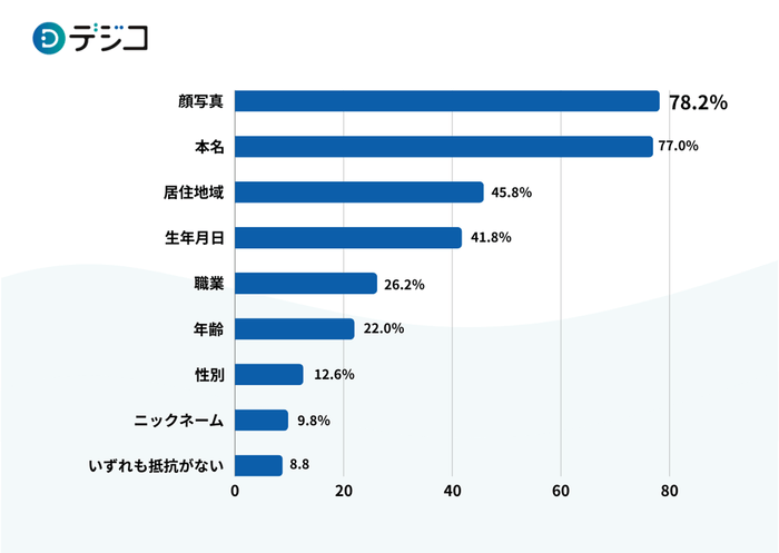 SNSを利用する際に、具体的にどのような個人情報を載せることに抵抗があるかたずねたところ、特に「顔写真」や「本名」への抵抗が大きく、その他では「居住地域」や「生年月日」などが多くあがりました。