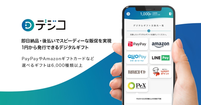 「デジコ」(https://digi-co.net/)は、初期費用・月額費用無料で、PayPay、Amazonギフトカード、QUOカードPay、LINE Pay、nanacoギフト、WAONポイントID、Apple Gift Card、Google Play ギフトコード、PeXポイントギフトなどに交換可能なデジタルギフトサービスです。1円単位1枚から当日発行することが可能です。いつでもすぐに必要な分だけ発行することができるため、企業の広告予算の調整や急なキャンペーンの実施などにも柔軟に対応することができ、当日まで人数把握が難しいイベントの謝礼などにも幅広く活用することが可能です。