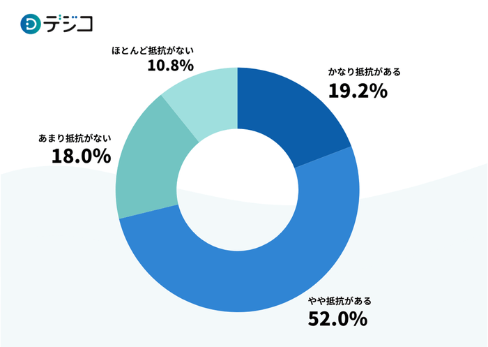 年代別で比較すると、年代が下がるほど「抵抗がない」割合が多くなる傾向が見られました。特に20代以下の若年層は、30.0%が「抵抗がない」と回答し、全体平均と比較すると16.8pt差と世代間ギャップが大きく見られました。