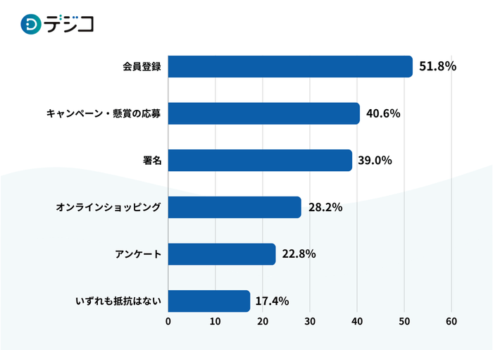 個人情報を提供することに抵抗がある場面をたずねたところ、「会員登録」や「キャンペーン・懸賞の応募」など日頃よく直面するシーンでも抵抗を感じていることが判明しました。