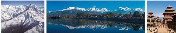 (左)遊覧飛行からのエベレスト※(中央)ペワ湖からみたヒマラヤ山脈(右)ダルバール広場