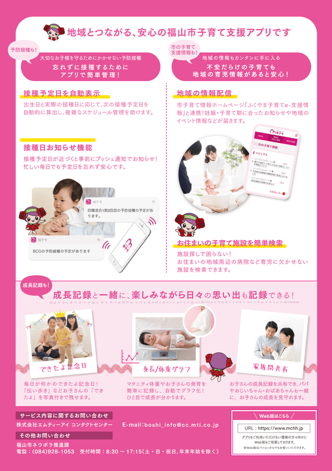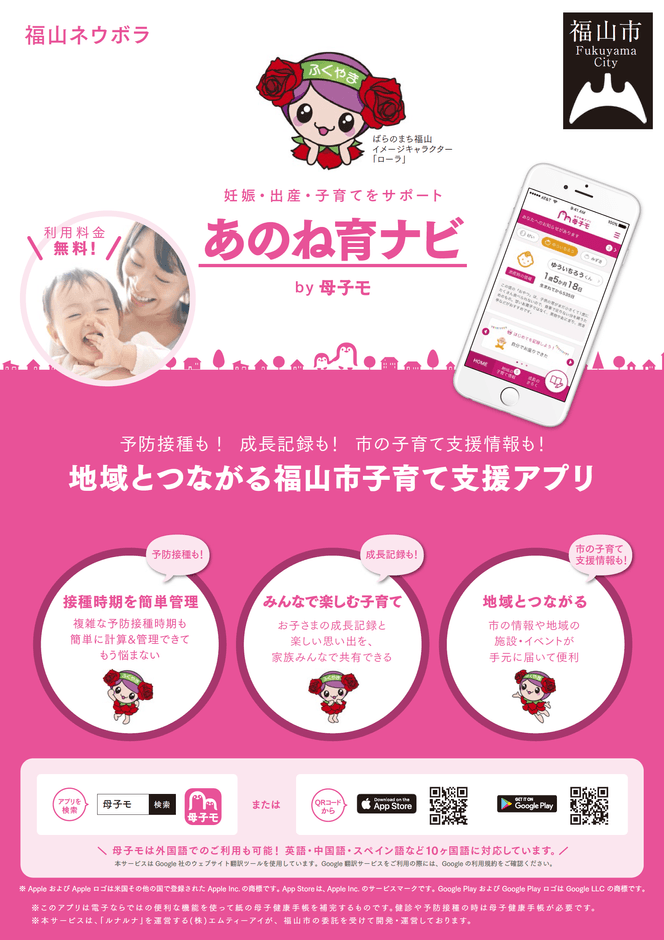 このアプリは母子健康手帳の機能を備えており紙の母子健康手帳と併用して便利に利用できるサービスです。また、福山市の子育て支援情報などをリアルタイムに受け取ることもできます。利用料は無料です。(通信料は利用者負担)