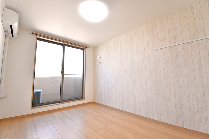 床は木製フローリング、壁は1面にアクセントクロスを採用。