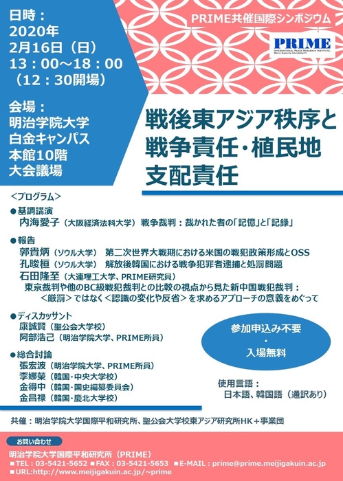 国際シンポジウム 「戦後東アジア秩序と戦争責任・植民地支配責任」 2/16明治学院大学白金キャンパスにて開催 ※無料・予約不要