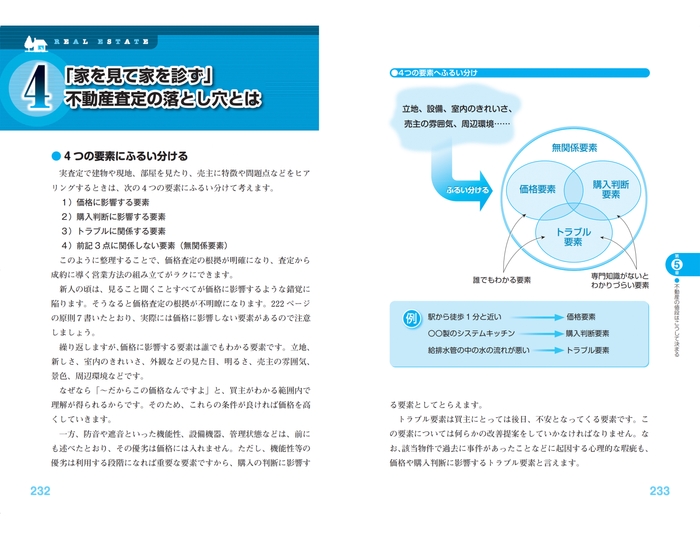 本書では、不動産の仕事に必要な知識やスキルを、調査、取引、金融、価格査定、契約の5つのカテゴリーに分けたうえで、最も大切である調査をさらに2つの章に分けて、全部で6章構成としました。