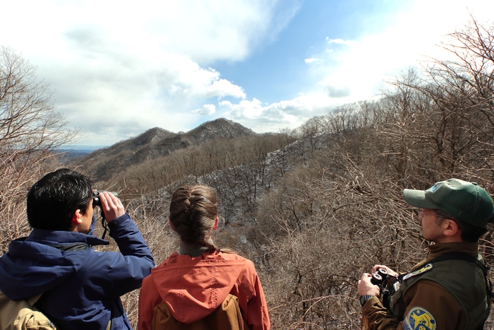 クマを最も観察しやすいのは、クマが冬眠から目覚める早春のわずかな期間です。木々の葉が茂る前なので、森の中の見通しがよく、新芽や地面に落ちたドングリを探して食べる様子を観察しやすいのです。人が近づけない斜面にいるクマを、谷を挟んだ対岸から双眼鏡や望遠鏡を使って探します。クマと十分に距離をとるため、クマの自然な行動をじっくりと観察することができ、なおかつ、安全も確保することができます。