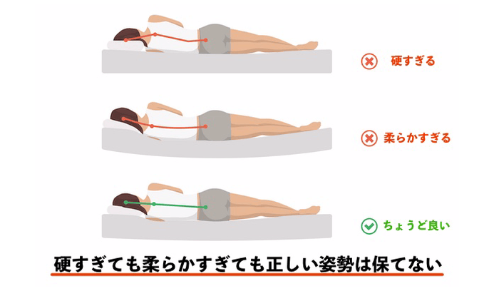 次のように、マットレスというのは硬すぎても柔らかすぎても正しい姿勢が保てずに体に負担をかけてしまうからです。