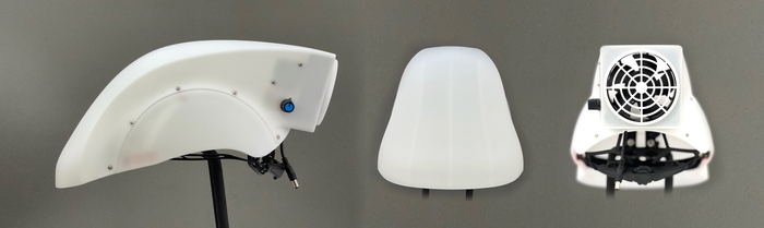 ・ヘルメット状のデバイスにエア流路を設け、⼩型ファンによって額上部からエアを噴出