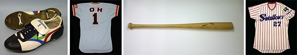 (左から)秋山幸二氏 スパイク、王貞治氏 ユニフォーム、イチロー氏 バット、古田敦也氏 ユニフォーム