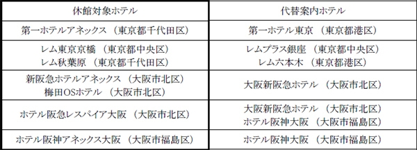 なお、休館対象のホテルにご予約をいただいているお客様には、近隣の直営ホテルを代替としてご案内いたします。