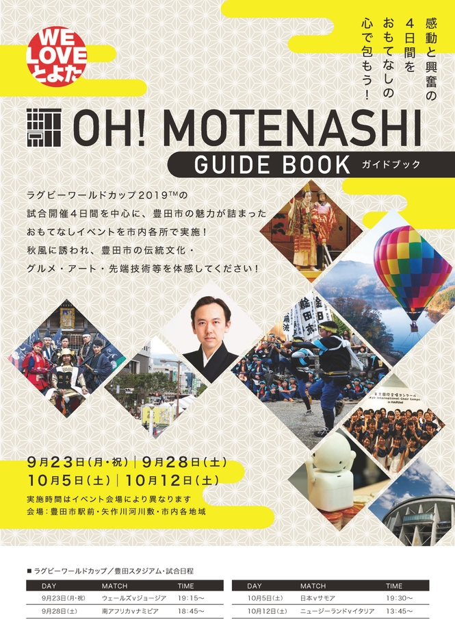 一般社団法人ツーリズムとよた(所在地:愛知県豊田市)は、ラグビーワールドカップ開催期間中の9月23日(月・祝日)、9月28日(土)、10月5日(土)、10月12日(土)に名鉄豊田市駅前を中心に、豊田市の魅力が凝縮したおもてなしイベント『OH!MOTENASHI』が開催されることを告知いたします。