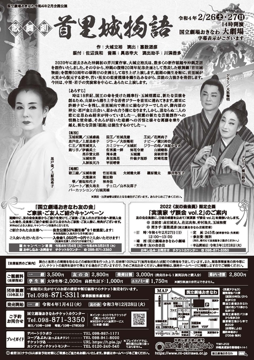 公益財団法人国立劇場おきなわ運営財団による『歌舞劇「首里城物語」』が2022年2月26日(土) ~ 2月27日(日)に国立劇場おきなわ 大劇場(沖縄県浦添市)にて上演されます。チケットはカンフェティ(運営:ロングランプランニング株式会社、東京都新宿区、代表取締役:榑松 ⼤剛)にて発売中です。