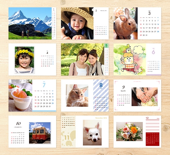 TOLOTカレンダー2015年版はデザインを一部変更し、自宅や職場など日常遣いできるシンプルなものから、贈答品としても活用できるエレガントなものまで、より幅広い層の利用を想定したデザインテンプレートを用意しました。完成品は1部ずつ配送先を指定できますので、年末年始の挨拶として実家や親戚に直送したり、友達や恋人にサプライズで贈ったり、卒業・卒園記念に配布したり、実用性の高いカレンダーを多様なシチュエーションでプレゼントしてはいかがでしょうか?