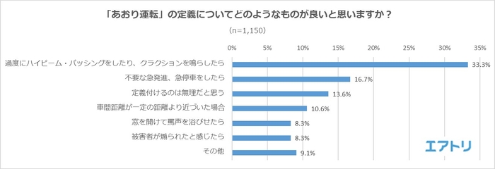厳罰化に伴い、「あおり運転」の定義をどうするのか?に注目が集まっています。どのような定義が良いかについては3人に1人が「過度にハイビーム・パッシングをしたり、クラクションを鳴らしたら」と回答しました。一方で、「過度」の判断も難しく、また13.6%の人は「定義付けるのは無理だと思う」と回答したことからも「あおり運転」の取り締まりの難しさが窺えました。
