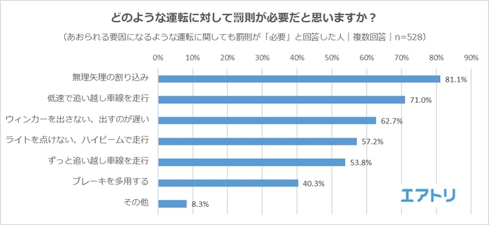 あおられる要因になるような運転に関しても罰則が必要と回答した人に対し、どのような運転に対して罰則が必要だと思うか聞いたところ、「低速で追い越し車線を走行」(71.0%)、「ウィンカーを出さない、出すのが遅い」(62.7%)を抑えて、「無理矢理の割り込み」(81.1%)が1位となりました。