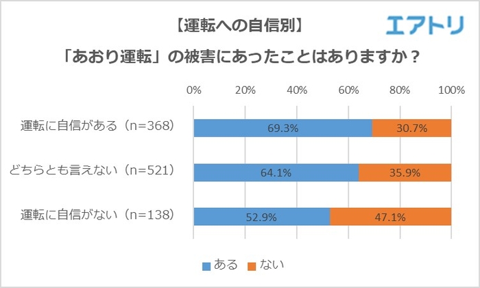―「運転に自信がない」と回答した人のうちあおり運転の被害を受けたのは52.9%だったのに対し、「運転に自信がある」人は16ポイント多い69.3%となりました。