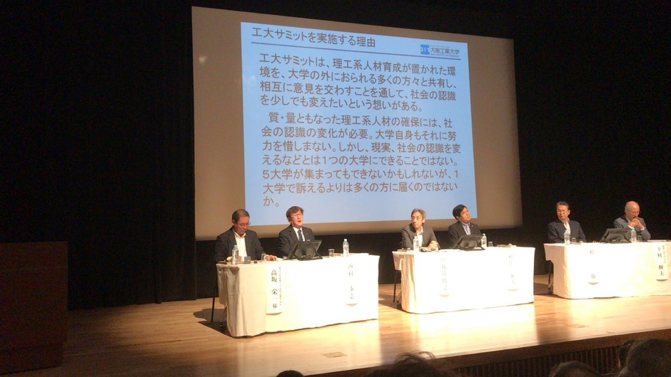 本年新たに、東北工業大学が工大サミットに参画し、6大学での開催となりました。テーマは「国際社会で活躍できる理工系イノベーション人材の育成」。教育研究改革の取組状況やIRデータからみる工科系大学の学生像を発信すると共に、工科系大学の人材育成への期待をテーマに、パネルディスカッションを行います。各大学によるポスター展示、ロボット研究の取組紹介と、ROBO-ONEの競技実演もあわせて行います。
