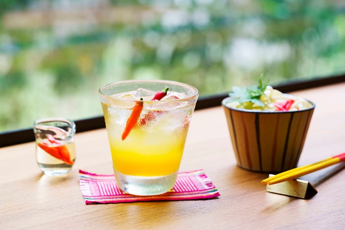 OMOカフェでは、沖縄そばと相性が良いオリジナルティーを提供します。ベースとなるさんぴん茶に、マンゴーシロップとパイナップルジュースを合わせ、アクセントとして、沖縄そばに欠かせない、泡盛に島唐辛子を漬け込んだ調味料「コーレーグース」を加えました。ピリッと感がくせになるオリジナルティーです。