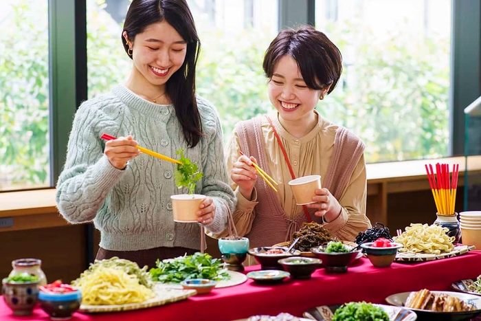 本イベントでは、丸麺、平麺、イカ墨麺、フーチバー(よもぎ)麺など、4種の麺から選べます。沖縄そばにかかせない出汁は、ご近所店舗さん特製のお出汁を用意しました。紅しょうがやラフテー(豚肉の三枚肉)、沖縄かまぼこ、卵など、好きなトッピングを組み合わせることで、ここでしか食べられない、沖縄そばを作ることができます。