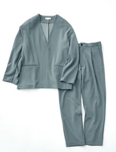 フランスの〈DELEGANT〉社のテキスタイルを使用。2WAYストレッチで動きやすく、トレンド感のあるダブル仕様のボックスシルエットに、パンツは今を感じるバルーン型。自宅で洗えるマシンウォッシャブル対応。