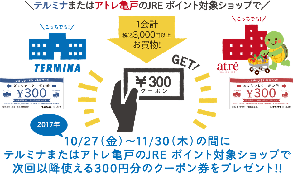 “錦糸町テルミナ×アトレ亀戸” JREポイントカード会員様限定 「どっちでもクーポンGETキャンペーン」 10月27日(金)より開催!