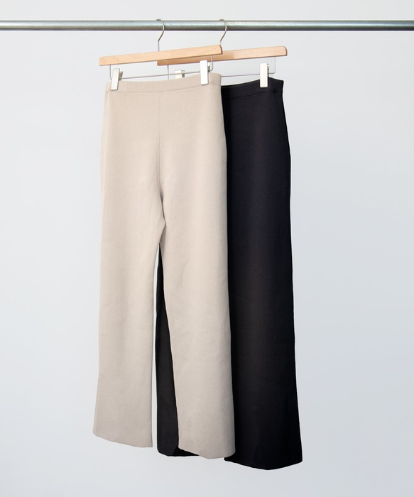 バックスタイルの裾にスリットを入れたシンプルなニットパンツ。生地に重たさがあるので高さのあるサンダルやスニーカーと合わせてもラフ見えせず、ウエストがゴムなのでストレスフリーにお洒落が楽しめるアイテム。