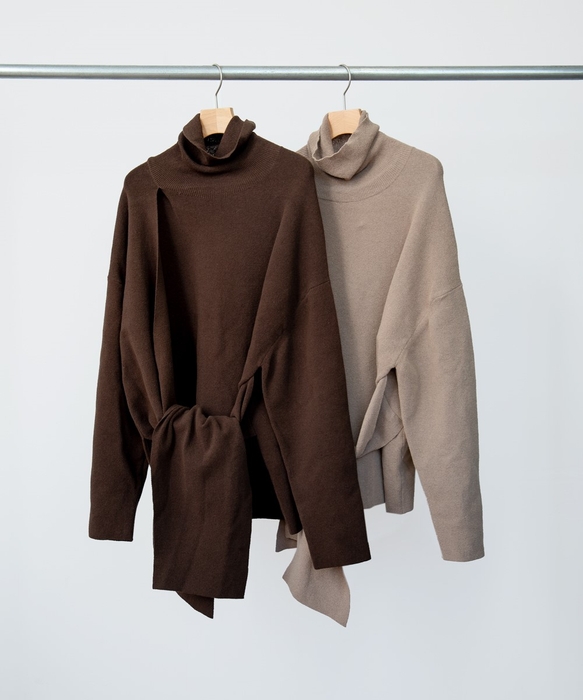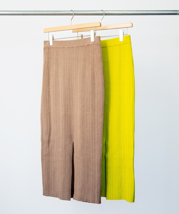 ランダムなリブ編みにすることでこなれ感を表現したスカートは前後着用できる2way仕様。レイヤードアイテムとしても使えるよう長めの着丈で、同色同素材を使用したデザインニットとの相性も良い。着まわし抜群なアイテム。