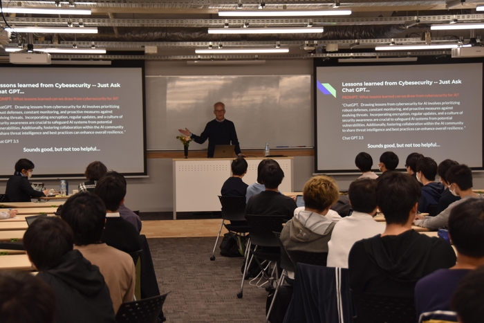 参加者からの質問も相次ぎ、野崎佑典助教は「AIは攻撃がどんどん最適化され、それから守ることとのいたちごっこが加速。この先の世の中をどう見ているか」との質問に対し、「AIを類型化し、その分類された間にバリアを築く必要があるだろう。リスクの度合いで類型化することが重要だ」と答えました。最後にポール氏は「本を読むことが趣味。サイバーセキュリティのことだけではなく、違ったアプローチからヒントを得られることもある」と幅広い知識の重要性を説き、締めくくりました。