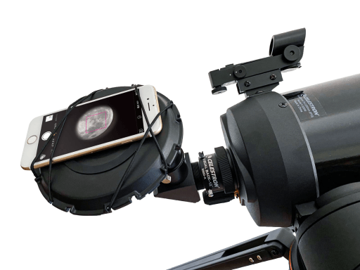 鏡筒の対物レンズキャップにスマートフォン用カメラアダプター機能を装備。レンズキャップの穴にスマートフォンのカメラを合わせてゴムで固定し接眼レンズ側にセットすれば、手軽に月の撮影ができます。