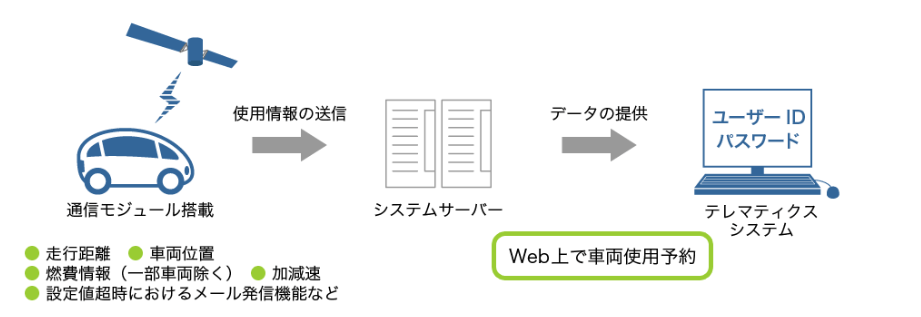 車両に通信モジュールを搭載し、社有車の速度超過、急加速・急減速などの走行情報を“見える化”する仕組み。