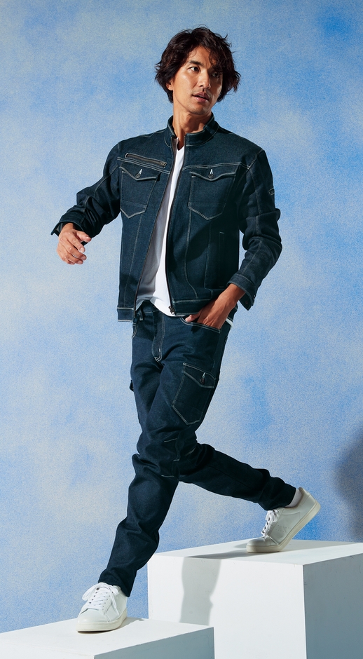 しかし、作業現場においては作業者の身を守る耐久性だけではなく、体を動かしやすいストレッチ性と長時間着ていても疲れない着心地が求められます。今回、より着心地の良いものとして商品化いたしました。特徴的なのはジャージライクな伸縮性を持ち、表は綾立ちの良い綿デニム、裏は滑らかなパウダリータッチの肌触りになっており、作業者に動きやすさと疲れにくさを与えてくれます。あらゆるワークシーンで活躍する事間違いありません。