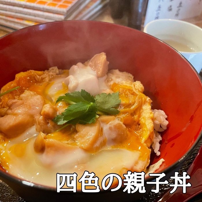 その親子丼は黄、白、橙、透明の四色!絶妙な火加減で火がよく通った部分とレアな部分を丼に表現致します。美味しい親子丼は四色のコントラストがいいです。一杯の中で卵の色々なお味をお楽しみください。