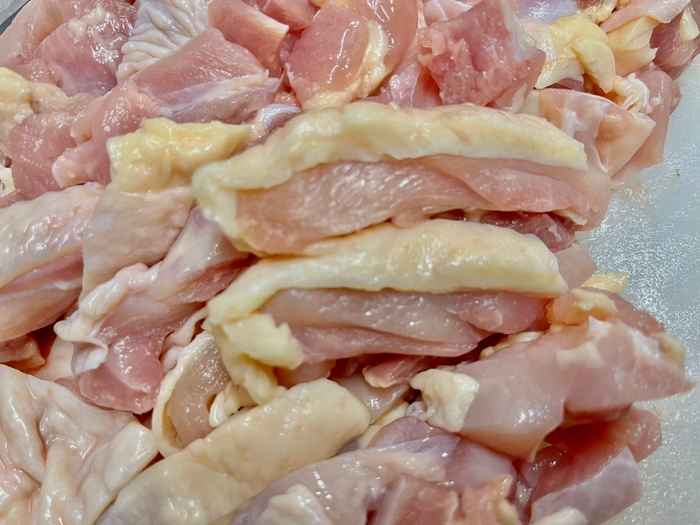 また、鶏肉の繊維を裁断して食感を良くするのも彩輝のこだわり。丁寧にバラした群馬県産銘柄鶏はエッジが効いてます。