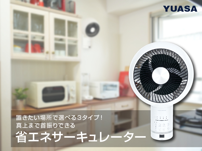 このたびユアサプライムス株式会社は、使用用途と使用される場所について検討を重ねた結果、サーキュレーターの利点をより使いやすい形で提供するために、扇風機の開発で培った技術を生かし、壁掛け、スタンド、置き型の3つのタイプのコンパクトサーキュレーターを商品化しました。