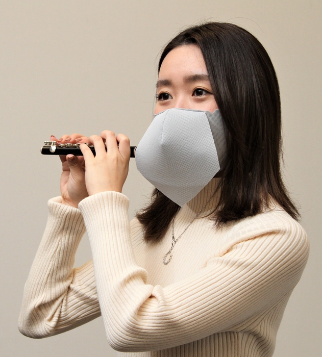 このフルート用マスクを使用すれば、演奏中に口元から出る飛沫を抑えたり、逆に外部からの飛沫を吸引する危険性を低下する効果が期待できます。さらにお伝えしたいのは、管楽器を演奏するときには他の奏者と打合せをしたり、レッスン中には先生から奏法の説明を受けたり、「話す」という動作が多く含まれますが、会話の最中にもちろんこのマスクを使えますし、そのままマスクを外すことなく演奏できる、というのは奏者のストレス軽減になるはずです。