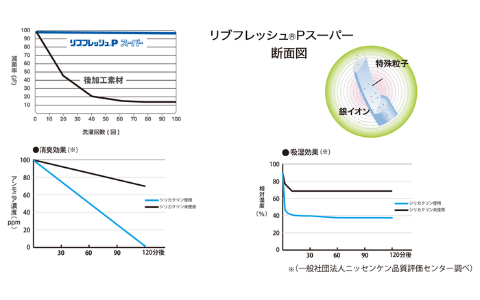 ※2 消臭・湿度調整効果、菌の増殖抑制効果については下記図表を参照ください(一般社団法人ニッセンケン品質評価センターおよびKBセーレン社調べ)
